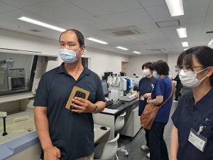 スクラブ(医療ウェア)がよく似合う落ち着いた雰囲気の方で、検査室に入る前からすでに頼もしさがにじみ出ていました。山本さんからコロナ禍での両津病院の対応や現在発生している感染症への対応の仕方などを聞き、お互いに情報交換をされていました。